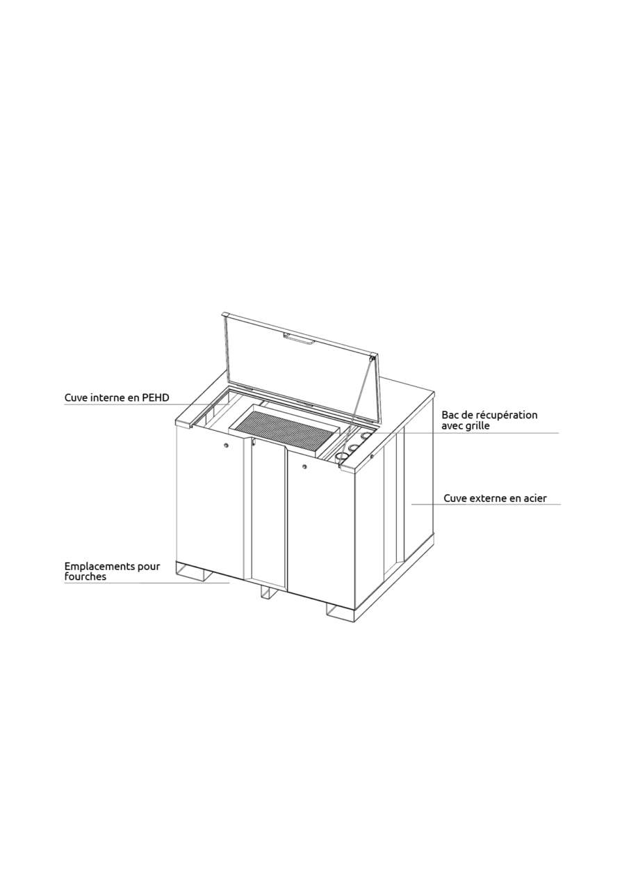 Le DechetBox Exel est muni d’une rétention capable de contenir 110% de la capacité de la cuve interne afin d’éliminer tout risque de pollution et de préserver l’environnement.